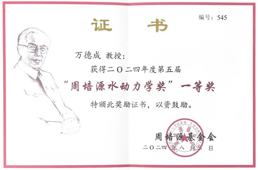 2024年度第五屆“周培源水動力學獎”的評選工作吸引了全國水動力學界的廣泛關(guān)注,評選委員會經(jīng)過初審、公示、兩輪投票、審核等程序,并將評選結(jié)果報周培源基金會批準,最終決定將一等獎授予上海交通大學萬德成教授、二等獎授予武漢大學季斌教授、青年獎授予北京理工大學黃彪教授。2024年度第五屆“周培源水動力學獎”頒獎典禮,于2024年8月3日在哈爾濱召開的第三十五屆全國水動力學研討會的開幕式上舉行。中國工程院院士、中國船舶科學研究中心名譽所長吳有生院士親自給萬德成教授頒發(fā)“周培源水動力學獎”一等獎證書,浙江大學、寧波大學教授林建忠代表周培源基金會為獲獎?wù)哳C獎。
